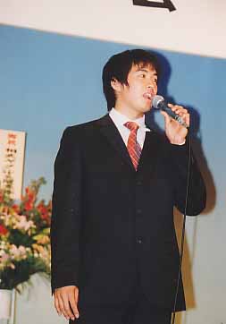 | ☆解説☆ パーティー参加前にイロイロとバタバタしてしまい、会場に着いた時には、パーティーも始まっていて、五十嵐選手の話が始まっていました。そのために、この時の話の内容に関しては全然わかりません。申し訳ありません。 五十嵐選手の話が終わった後、そのまま本人は壇上に残って、続いて、杉浦さんの話に。五十嵐選手の魅力やこれからの期待について語っていました。五十嵐選手を獲得した時に、球団のスカウト担当だったので、裏話などしてくれました。その話をじっくり聞きながら、五十嵐選手はイロイロと考えている様でした。時々、今シーズンの成績についてなどへの、辛口なコメントもありましたが、先輩からの助言を肝に命じて聞き入っていたようでした。 話が終了した後、来賓の方の出迎えなどで五十嵐選手は、若干席を外します。その間に、マックス亮太さんの紹介で、亮太ママや奥さんと話をしました。そんな時、合間を見て、五十嵐選手が戻ってきたので、マックス亮太サンと一緒にプレゼントを渡して、ちょっと話をしました。その時、私はカードに名前入りでサインをしてもらいました。 その後はゲームの時間と称して、出席者にプレゼントが当たるストラックアウトが始まりました。準備をしている間に、高津投手登場。急遽、五十嵐・高津、来賓で来ていた藤井の3選手でストラックアウトをすることに。室内ということでボールはテニスボールを使用。最初は、もちろん主役の五十嵐選手が登板。最初の2球は全然当たらず…3球目にしてやっと真中の5番に命中(で当たってますか?)。その後、藤井→高津→五十嵐と投げて、3枚の的を射抜く。(空いた的の番号は、4・5・8or7?カナリ曖昧です…マックス亮太さんの記憶が1番正しいと思います)五十嵐選手が投げている時は、地元の友達から「○番に当てろ!」などという声が出たりしていて、本人も「じゃ、○番狙います!」みたいなカンジでサービスしていました。でも、実際は違う番号のところに当たってました。ストラックアウト終了後、高津投手は、すぐに帰ってしまいました。 高津選手を見送った後、チャリティーオークションを行いました。五十嵐グッズばかりの出品かと思いきや、球団総出で出品していました。(出品選手→稲葉・真中・石井弘・藤井・岩村・宮本・古田)お客サンとの掛け合いが楽しかった様で、楽しそうに仕切っていました。オークション終了後、売上金をチャリティーの財団の社長に本人の手から渡されました。急遽、社長の行為により、売上金額に数十万円をプラスして80万円を財団に寄付することになり、五十嵐選手ビックリ!!カナリ素の状態で、「ホントですか!?ホントにいいんですかぁ!?」って言っていました。 この後、司会の方の説明で、写真撮影会をスタート。五十嵐選手本人が会場を回って歩く、というものだったのですが、すぐに出席者に囲まれてしまい、ずーっと同じ場所でファンの人達に囲まれて、サインをしたり、一緒に写真を撮ったりしていました。その間に、マックス亮太サンと食事を取りました。写真撮影会は、20分もしないうちに時間の関係で終了。 本当に時間が押していた様で、そのままバタバタっと司会の方の進行で、球団関係所の挨拶ということで、杉浦さんがまた登場して、今回のパーティーについてや、五十嵐選手については語りました。この話の最中で、婚約者である織江サンが杉浦さんから紹介されました。その後、五十嵐選手が壇上に上がって、今日のパーティーのしめに、今日の感想やこれからの抱負を語りました。そして、パーティーは終了。最後に会場の出口で、出席者全員を織江さんと一緒に見送っていました。 レポート:ありす |