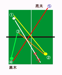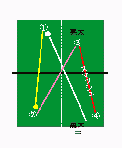 | 右サイドラインにスマッシユして、亮太満面の笑み・・・。 | 黒木の動きを見て右スペースにスマツシュするも、焦ってネットに掛けて苦笑いの亮太。 | ナイスラリーも最後は黒木のミスで亮太にポイント。 |