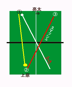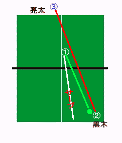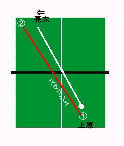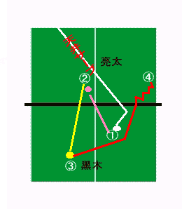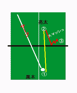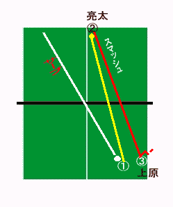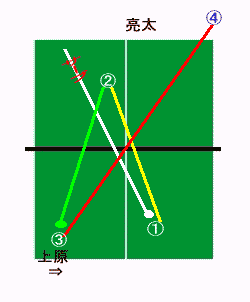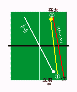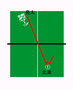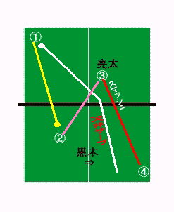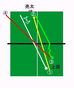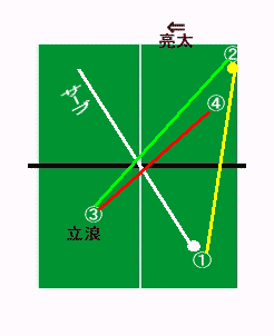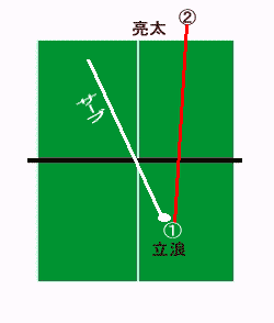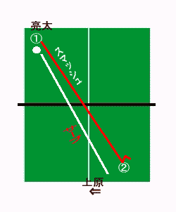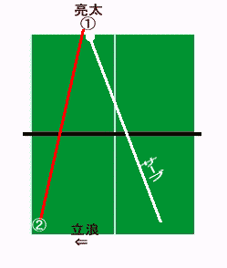| 亮太の逆をついて軽〜くスマッシュで、立浪のポイント。 | 亮太にしてはめずらしく、軽くライン際いっぱいに決める。 | 立浪のリターンがラインを狙い過ぎでアウト、ポイント亮太。 |