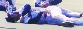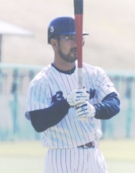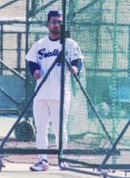 アップを終わったので土橋が戻ってくると思っていたら、副島選手から渡されたグラブを持って外野の方へ・・・・・。 「あれ!?」。外野でバツティング練習の玉拾いであった。高梨・阿部・辻の打球を処理する土橋であるが、何とも暇そうである。遠方にいるのでナイキマークのTシャツを着せたら”月の輪熊”に見えてきます。 熊土橋が好きな方、嫌いな方といると思いますが、このサングラスは似合ってますかね〜。なんか髭をはやしたペルージャの中田みたいですね。いつになったら剃るのでしょうか・・・・ そうこうしていると打撃練習の順番が来て、土橋・副島・小早川の3人で順番に打撃ゲージに入りました。 土橋はケガをしてから今日が初めての打撃練習です。バツティングピツチャーは、引退の決まった辻選手じゃないですか????。しかしピッチャー辻、なかなかのコントロールで土橋も軽快にボールを飛ばす。 が、久しぶりの打撃練習&ピッチャー辻の球威で、土橋バットを折る。 時間も15分くらいたったところで、ピッチャー住友に交替。大丈夫か〜と思っている矢先に、住友の投球はバッティングゲージに突き刺さる。その後も投げても投げても抜ける球ばかりでストライクが入らない。 ゲージの土橋も唖然・・・練習にならんわ〜 てな顔をしていました。 |