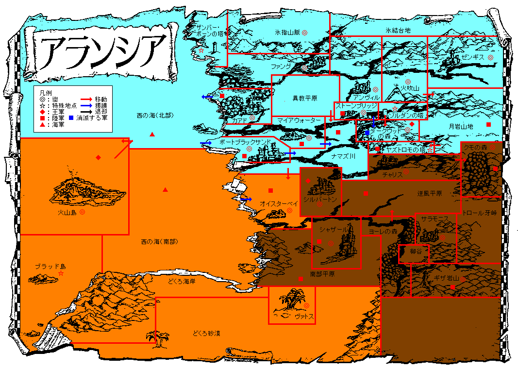 陸軍 カアド 援護 海軍 西の海(北部) 援護 陸軍 ポートブラックサンド 援護 陸軍 異教平原 移動 ナマズ川