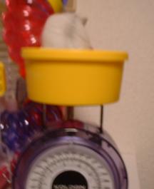デブハムの体重測定。 えさ入れの中に入れて測っています。 7月14日 |