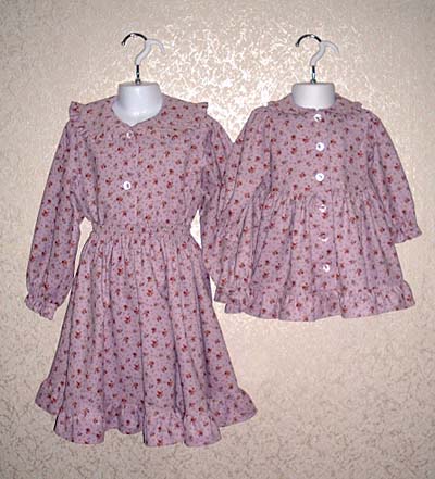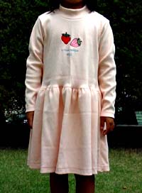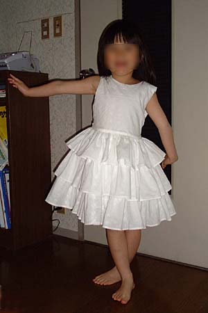 2003年4月の課題服「ちょっとしたよそ行き着」です。生地は表が綿レース。裏にブロードを使っています。身頃にリボンを付けようかと思いましたが、ない方がスッキリしているのでつけていません。後ろリボンです。ギャザーが多いのでボリュームのあるスカートになりました。 |