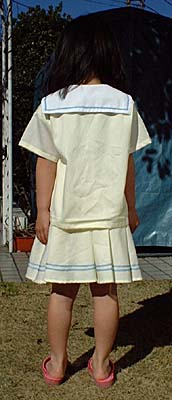 ![]() ![]() 2003年4月の課題服「ちょっとしたよそ行き着」パート2です。生地は薄い黄色のピケ。襟は白のブロード。ラインは薄い水色を使っています。ボタンはイカリのボタンです。スカートはサーキュラースカートなのでくるっとまわるとフワッと広がります。 襟のアップはこちら。 |