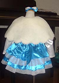 ![]() 七五三の服です。生地はサテンのブルーと白(色はリボンを見てください)、オーガンジーの白。 ケープはフェイクファーと裏地?を使っています。 ドレスの下スカートはオーガンジー2枚重ねと サテンオーガンジーと3枚のスカートを ギャザーを引きまくったので、 パニエ無しでもスカートが広がって見えます。 (パニエほどじゃないけど)。 脇にリボンを縫い込んであり、後ろで結んでください。 ![]() ![]() ![]() ![]() ![]() |
