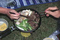 | 荷物の中身はビール? | 徳沢野営場。最高です。 | 夕食はすき焼き |