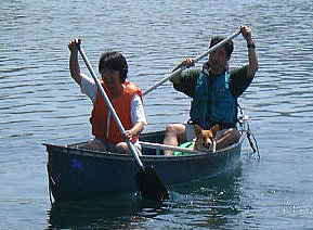 今回のキャンプで一番楽しみにしていたのが、カヌー。 最初は不安定で怖かったのですが、すぐに慣れ、調子に乗ったエルザ母とこんは対岸まで往復してしまいました。湖上の風が気持ち良くエルザも最後は余裕の表情でした。 |