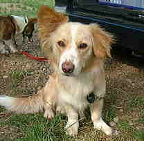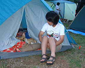 朝が苦手のエルザは、キャンプ場でも相変わらず寝起きが悪い。 呼んでもテントの出入り口でパタン。 但し、朝食の支度のガサガサですっ飛んで来たのは言うまでもありません。 |