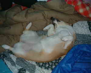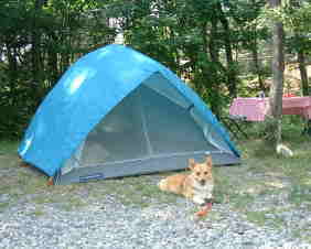 さんざん遊びまくったエルザなのですが、食事時は相変わらずのガウガウ攻撃。静かなキャンプ場なのでエルザの鳴き声が響き、ああ恥ずかしい。 しかし、食事の後は朝まで爆睡状態でした。 |
