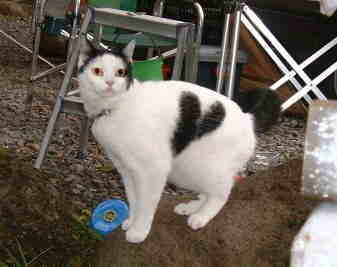 隣のサイトに居た同伴ニャンコのトム君。大阪から遠路はるばるやって来ました。小さな頃から一緒に旅行していたとの事で、すっかりキャンプ慣れしていました。うちのさくらは無理だろうなあ。 お腹のハートマークに注目です。 |