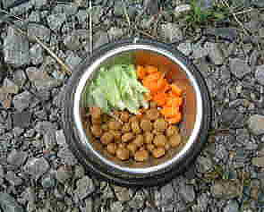 せっかくの高原野菜をエルザにも味あわせてあげようと作ったのが、ドックフードの高原野菜添え。けれども、エルザはせっかくのスペシャルディナーを味わう事もなく、あっと言う間に平らげてしまいました。 |