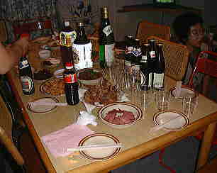 待ちに待った夕食は各自持ちよりの品を加えた豪華版。 京都・名古屋・静岡・千葉と各地の名物料理とお酒、地ビールがテーブルに並び、皆楽しく食卓を囲みました。 食事中は、エルザのくれくれ攻撃にさらされたのは言うまでもありません。皆さん、お騒がせしました。 |