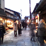 午後、七人で、錦小路、清水寺、三年坂と巡る。三年坂に至りしは黄昏時なり。土産売る店々の灯の流れ出でて、行き交う遊覧の客を影となす。余りに名高き故に、却って興味も持たざりし街の、かかる姿もあらむと、思いを新たにす(左写真)。夢の内にある如き心地して歩む。