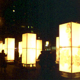 地下鉄の駅を出れば、広き通りの両側に、高さ三米ばかりの直方体の灯り立ち並ぶ。灯路祭と称す。車の通行を止めて、人々道幅一杯にそぞろ歩く(右写真)。