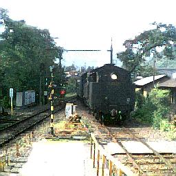 駿河徳山駅に入る、千頭よりのSL。 C11が後ろ向きに客車を引いている。 C11の実働は、この鉄道のみという。 (120712撮影)