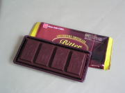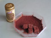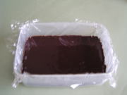 C タッパーなどの容器にサランラップを敷き Bのチョコレートを流し込みます。 D 冷蔵庫で冷し、固まったら1.5cm角くらいの大きさに切り 手で一つ一つ好きな形(○でも□でも△でも)に整えます。 |