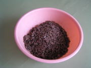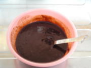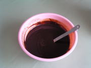 | B @(刻んだチョコレート)の中にA(水あめを溶かした生クリーム)を入れ、 かるくかき混ぜた後、ブランデーを30CCほど混ぜ合わせます。 |