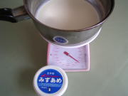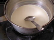| A 鍋に生クリーム200gと水飴60gを入れ弱い火にかけ、 生クリームが沸騰しないようにかき回しながら水あめを溶かします。 |