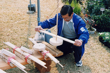 火熾しきの材料は、紐と丸棒以外はすべて「森の熊さん」所有の山林から調達して