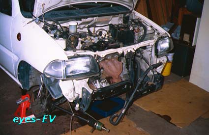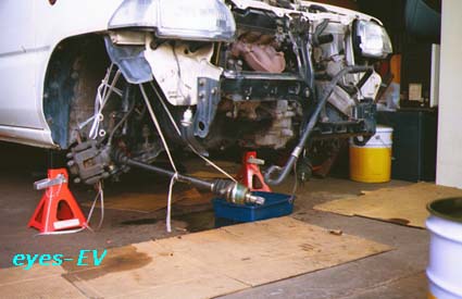 | いよいよドライブシャフトをはずしてエンジンをおろそう。 『エンジンよ、さようなら』なのである。 教わったとおりにまずはタイヤをはずして、ミッションにつながったドライブシャフトを外側に叩き出せば簡単にはずれる・・・はずだったのに外れない。 なぜだ?何か忘れているのか? メモを見る。いやそんなことはない。ならばもう一度。 外れない。なぜだ?ウ〜ン・・・ 土曜の昼前、今井さんはいるかな? 電話。(お忙しい中申し訳なかったです) 間違いない。3度目の正直。にはならないのである。外れない。 困った。『そうだ、三菱に行こう。』と言うことで、いつもの東海三菱静岡南営業所へ。 訳を説明すると、どうぞどうぞと工場の方へ。 『それならこうしてこうして・・・』 『わっかりました〜〜』 |