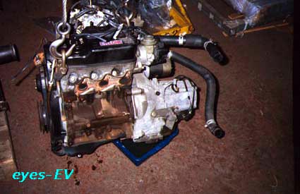 いよいよエンジン降ろし当日。緊張します。ミニカトッポの狭いボンネットからうまくエンジンが出るでしょうか。いやいや出さなければなりません。実際、クラブ員で大阪の水原さんがすでに三菱ミニカのコンバートをしていらっしゃる。同じエンジンルームに同じパーツ。出来ないはずがあるものか。いざとなったら・・おっとそれは最後の手段。なるべくオリジナルパーツ・方法で。エンジンにロープを回してチェーンでつり上げ。ちょうどテンションが張ったところで、取り付けてあるねじをはずしていきます。緊張の瞬間。 バランス良し。一気につり上げたいところだがそのままではボディにぶつかってしまう。ゆっくり慎重に、ここでエンジンを傾けて・・・そう、ゆっくり・・・よっ〜〜し、出たぞ!! おおっと、油か漏れている。ゆっくり移動して、ゆっくりおろせ。やっとの事、エンジンがおりました。2日がかりです。(作業日数で。なれた人なら半日だとか・・・)