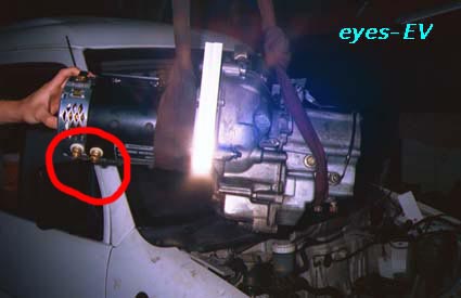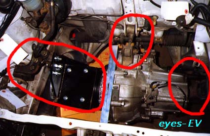 | 固定箇所は3カ所。ミッション側/右1カ所・中央1カ所モーター側1カ所。このうち、ミッション側の2カ所はオリジナルのものが使えます。従って、ボディ左のオリジナル金具と、モーターの金具を結ぶ『新たな金具』が必要になります。これに関しては薄い板を使って、現合で寸法をとり、溶接して製作しました。 | |||||