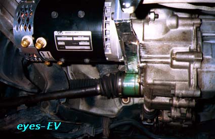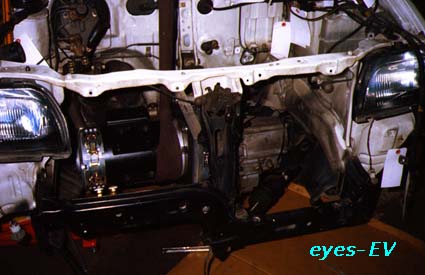 | エンジンに比べモーター&ミッションはコンパクトでバランスもいい感じ。 なかなか美しい絵です。ボンネット内へ入れるにも、エンジンをおろすときほど苦労はありませんでした。が、ちょっとしたミスで、ボディにこつんと当てたら・・・アラら、へこみが、まあ、後で何とかしましょ。 |