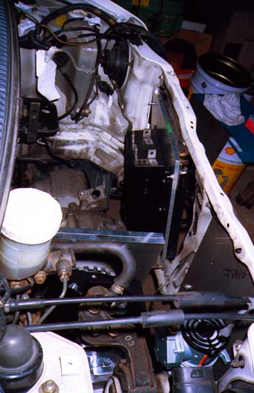 | いよいよ電機部品の取り付けにかかります。 ラジエターのフィンにアルミのプレートを抱かせ、コントローラーを取り付けます。こうすることで、コントローラーの熱はアルミプレートに伝わり、全面からの風で冷やせるだろうと考えたのでした。 また、アルミプレートがあるので、全面からの雨の浸入も防げます。縦置きで配線するのも簡単。いい感じです。 |