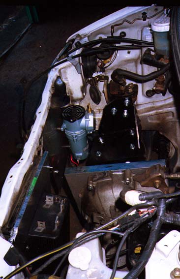| 反対側にはステンレスの薄いプレートを折り曲げてブレーキ用コンプレッサーを取り付けます。写真には写っていませんがその横に並べてエアタンクを取り付けます。 実作業としてはこの日の作業は取り付け板の製作でした。他のパーツの取り付け板を製作・取り付けした後、固定・配線を行います。 |