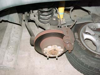ジャッキアップして、タイヤを外すとブレーキ部分が見えます。