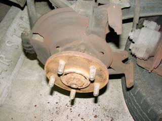 リテーナを外したら、後はローターを引っ張るだけで外れます。おいらの場合、右側は中心部が錆でくっ付いて抜けませんでした。くっ付いている部分の近くを、何かを当てた状態でハンマーでカンカン叩いている内にローターがグラグラしてきたので、そんな感じで外しました。