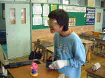 疑似体験アイマスク、軍手をつけて、指定された駅までの料金を貯金箱に入れる。
