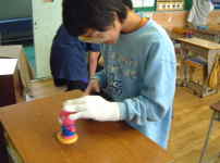 疑似体験アイマスク(自作)…防護めがねに黄色のセロファン、エアクッションを貼る