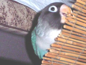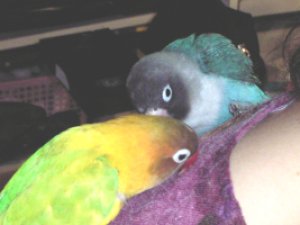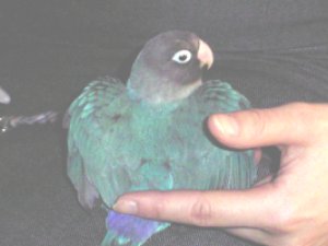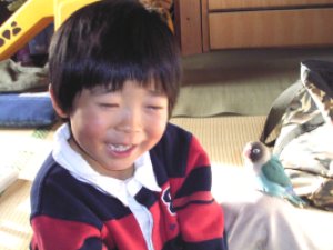 ぴよぴよのひざの上に 止まってみました。 このときはとてもいい感じですが 数日後、ぴよぴよの手に 思いっ切り噛みつきました。(>_<) |