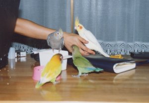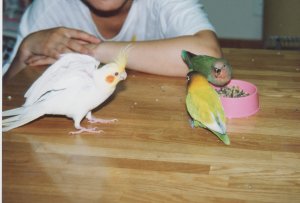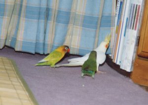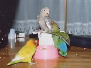 ちゅるるとももが、餌を食べているところに 「ぼくもまぜて〜〜!」とやってきた ちぇり−。 この3羽はよく一緒に行動します。 |