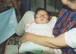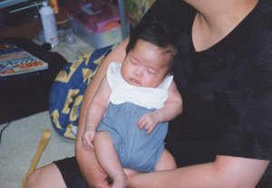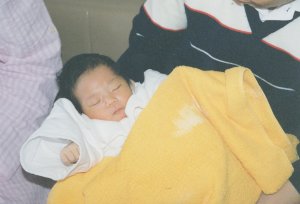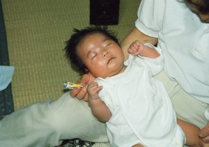平成13年4月10日 午前0時47分 3204gで誕生しました。 (胎児仮死の状態で、緊急帝王切開でした。) 胎便吸引症候群の疑いで、 点滴治療を受けました。 この写真は生後10日くらいです。 |