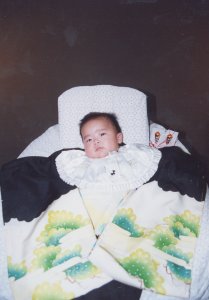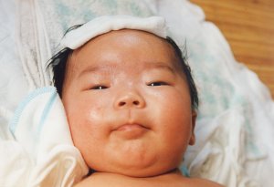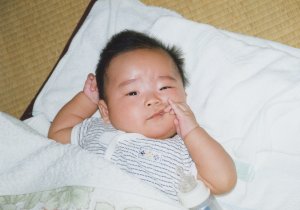 とても3ヶ月の子供の顔には 見えませんね、この写真。 (パパにうりふたつです) 湿疹は良くなりましたが、あせもが…。 |