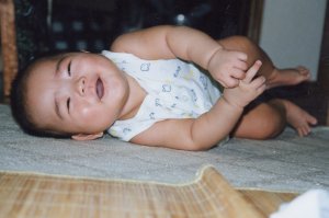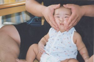 大きなパパの手に顔がすっぽり おさまってますね。 この子は絶対太りすぎだ〜と 思っていたけど 検診に行ったら、標準だと言われ、 ビックリ!! |