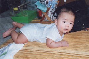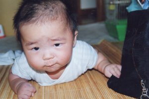 寝返りを打てるようになりました。(^O^) でもまだ、腕の力が弱く、 すぐ力つきて、泣き出します。 |