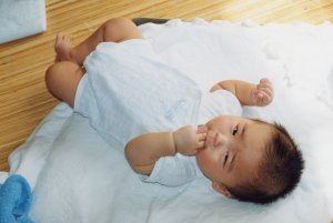 指しゃぶりしてますね〜。 なんでも口に持っていこうとするので 目が離せません。 |