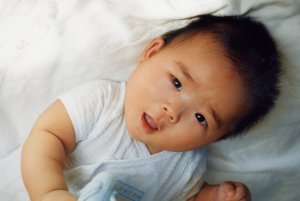 何とも言えない、この表情♪ ケラケラと、よく笑います。(^_^) 寝返りを打っても、しばらくそのままで 我慢できるようになりました。やった〜! |
