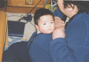 パパのフリースの中でじっとしている ぴよぴよ。 まるでカンガルーの親子 みたいですね〜。(^_^;) |