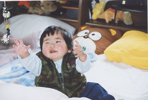 | 居間を出て、どこに行ったかと 思ったら、ベッドの上に乗って 遊んでいました。 電気のひもにくっついている マスコットを一生懸命 取ろうとしています。 |