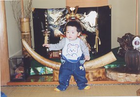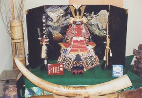 上の写真ではわかりにくいので、 5月人形だけの写真です〜。 (前に飾られている象牙は元々 家にあった物です。) 右下に置かれている青い写真立てが オルゴールになっていて、ぴよぴよは それが気に入ったようです。(^_^) |