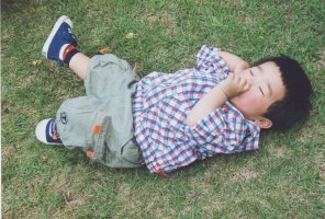公園の芝生の上でゴロ〜ン! この日はとても天気が良く 寝っころがるぴよぴよは 気持ちよさそうでした。(^_^) |