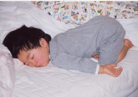 寝相の悪いぴよぴよです。(>_<) 何度仰向けにしても、 こうなってしまうんですよ〜。 よくこんな姿勢で寝れるなぁ。(^_^;) |