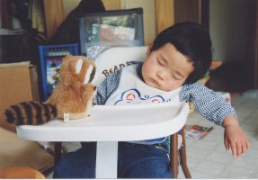 | 食後、すぐに眠ってしまったぴよぴよ。 レッサーパンダ君が近づいても まったく気がつきません。 |