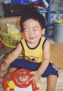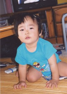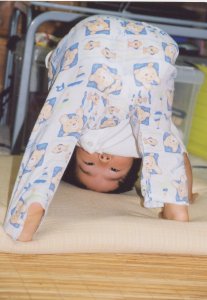 最近、よくやるポーズなんです。 顔をのぞき込むと、 ぴよぴよもおもしろいらしく ケラケラ笑います。 |