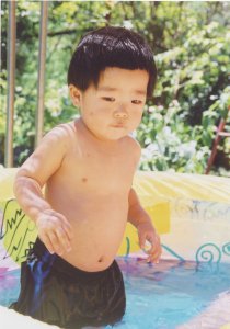 庭にプールを作って、 気持ちよさそうに遊んでいます。 海パンが少し大きいのかしら? お腹がたるんでるように 見えますね〜。(>_<) |