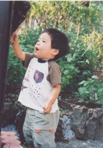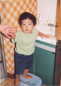 お外で遊んだ後は きちんと手洗い! 最近では、踏み台がなくても 洗面台の縁に手が届くように なりました。 |